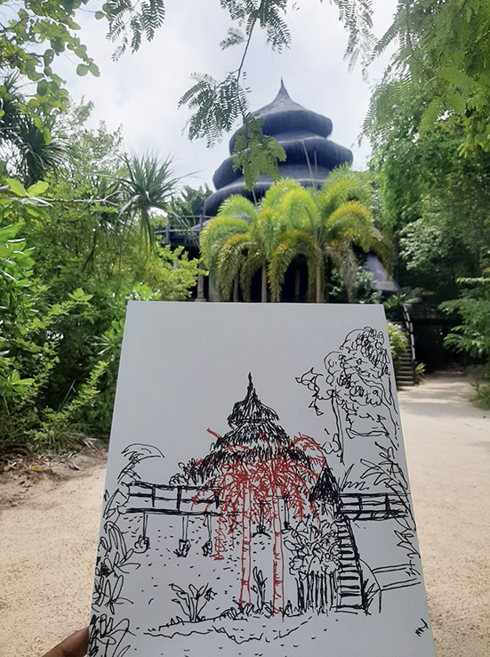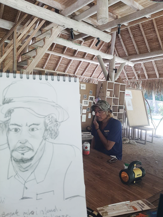 In addition to working on my main project, in between studio activities, I make brief sketches on location, using various objects on Nikoi and Cempedak Islands. These brief sketches serve as a social memory and experience. While I could have done them with my phone or DSLR camera, hand-drawn sketches hone my artist's sensitivity to capturing the character of objects, things, and people.
